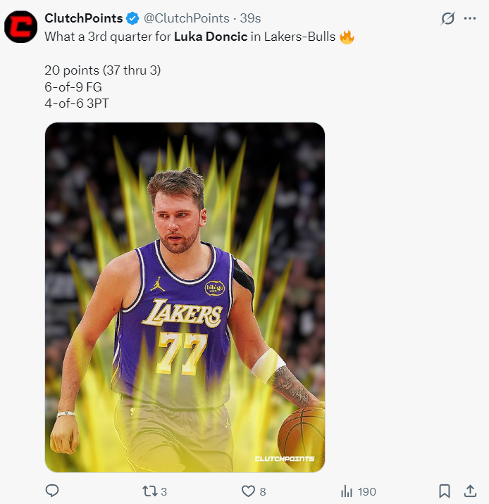 北京时间1月27日,卢卡-东契奇再度迎来里程碑,他65场比赛已经拿到2000分成为湖人队史最快的2000分先生。而且这场比赛东契奇第三节单节20分帮助湖人顶住了公牛的反扑,全场比赛拿到46+11+7+8三分的数据帮助湖人拿下胜利。